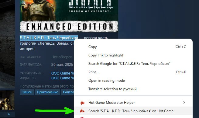 Если вы установите расширение, то при выделении текста на любом сайте у вас будет появляться пункт в контекстном меню "Искать выделенный текст на Hot.Game". Также как стандартно есть поиск в Google (или другом стандартном поисковике).
