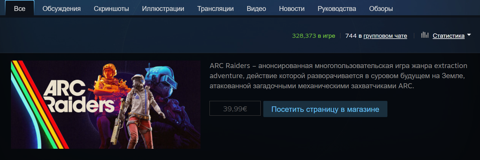 Arc Raiders от Embark Studios взрывает Steam: максимальный онлайн составил 328 412 игроков, игра ворвалась в топ-4 после пика 264 673.