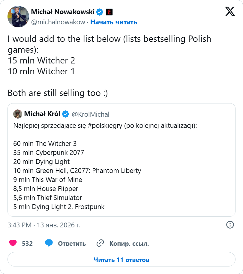 Один из генеральных директоров CD Projekt RED Михал Новаковский раскрыл продажи ранних частей серии The Witcher. По его словам, первую игру купили 10 миллионов раз, а The Witcher 2: Assassins of Kings — 15 миллионов.