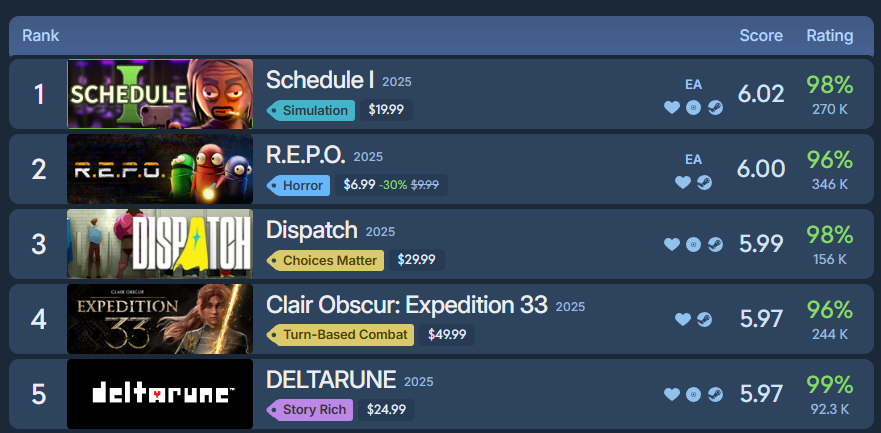 Аналитический ресурс Steam250 подвёл итоги 2025 года, составив рейтинг лучших игр на основе пользовательских оценок и количества отзывов в Steam. Первое место заняла кооперативная Schedule I, опередив десятки громких релизов.
