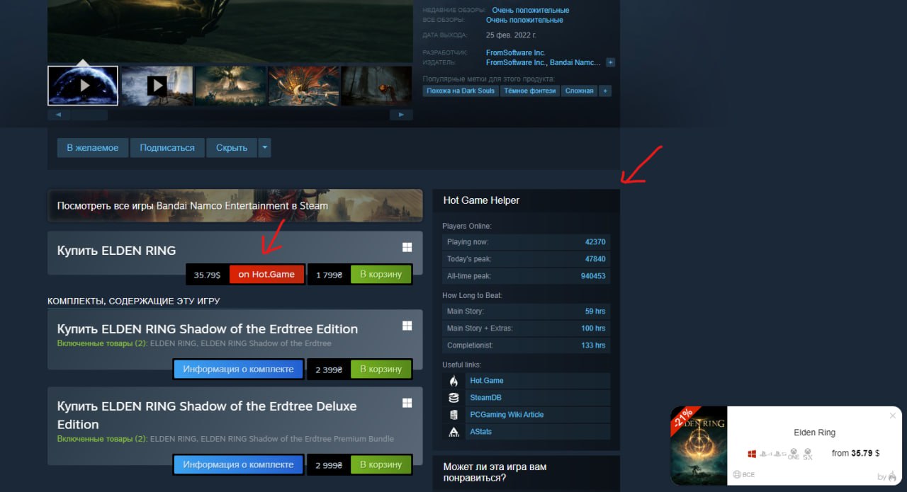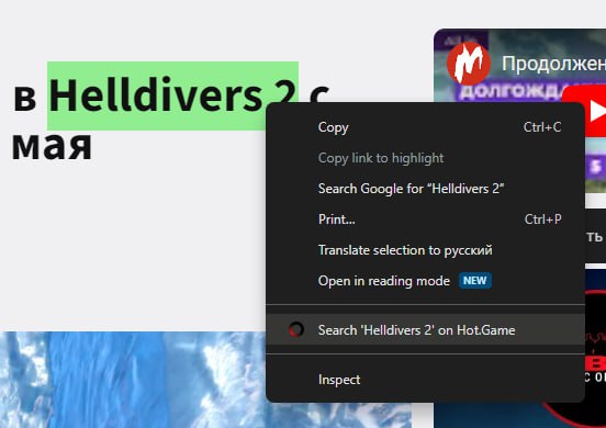 Нет, такого видео нет ( Но мы можем вам по быстрому расписать здесь все функции 🙃: 1. Быстрый поиск на HG: здесь все просто, появится новый пункт в контекстном меню, выделяете название игры и нажимаете "искать". 2. Подсказки о минимальных ценах. Вы открываете страницу игры в каком-то магазине, например, Steam, GMG или SousBuy (да в общем практически любой, который есть в нашем каталоге), а в правом нижнем углу видите подсказку, какая цена минимальная на эту игру в нашем каталоге. 3. Подсказки о минимальных ценах на YouTube и Twitch. Такие же подсказки, смотрите видео про Helldivers II, а в правом нижнем углу есть подсказка о том, сколько она сейчас стоит. Эти подсказки автоматически закрываются через 6 секунд (это можно отключить). 4. Расширенный поиск. Очень важная функция (только для продвинутых пользователей). На HG появляется в строке поиска другая иконка лупы (в цветах логотипа расширения), при клике по ней поиск происходит не нашем каталоге игр, а в нашей базе данных всех известных нам цен практически во всех известных нам магазинах. Таким образом можно искать любые игры, даже те, которые еще не добавлены на HG. Поиск этот поддерживает разнообразные флаги и модификаторы в строке (вот это точно для ОЧЕНЬ продвинутых пользователей), об этом всем можно прочесть нажав по иконке "?" на странице результатов расширенного поиска. 5. Совсем свежая функция: повышенная интеграция со Steam. На страницах игр в Steam появляется цена игры на Hot.Game, а в боковой панели появляется дополнительный блок с информацией об онлайне в игре и о продолжительности игры (сколько часов вам понадобится, чтобы пройти ее полностью), а также полезные ссылки (на HG, SteamDB и т.д. и т.п.). Ну и самое важное: любую из этих функций можно отключить в настройках. Например, очень многим не нужны подсказки, но нужен расширенный поиск – не проблема. Или подсказки в целом ничего, но они не нужны в YouTube и Twitch – и это можно сделать.