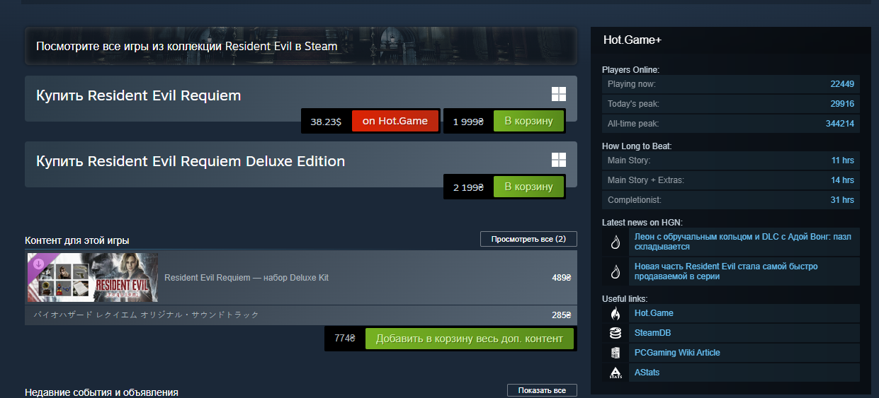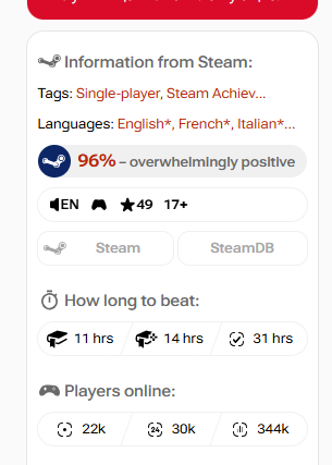 - В Steam выводит доп.инфу про игру (онлайн, HLTB, ссылку на HG и SteamDB) и разумеется лучшую цену.