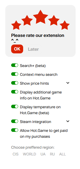 Спасибо за развитие расширения. Из всех фич пользуюсь только поиском по всем магазинам. Страницы в стиме кастомизирует мне расширение от StemaDB.