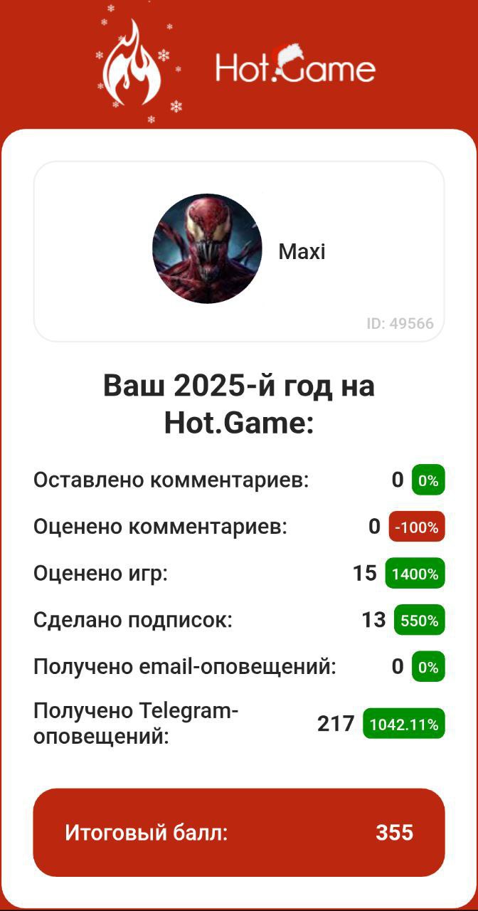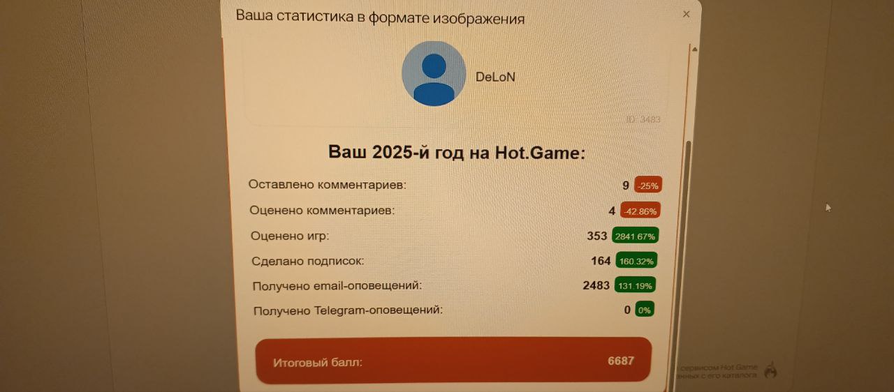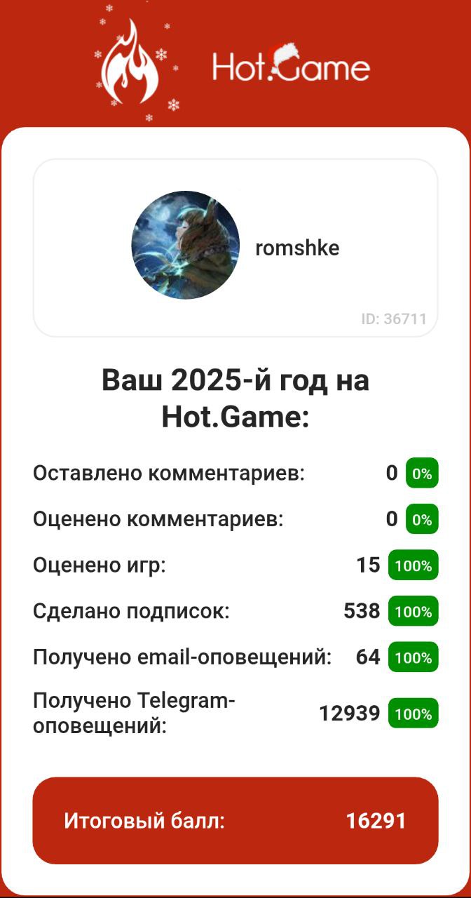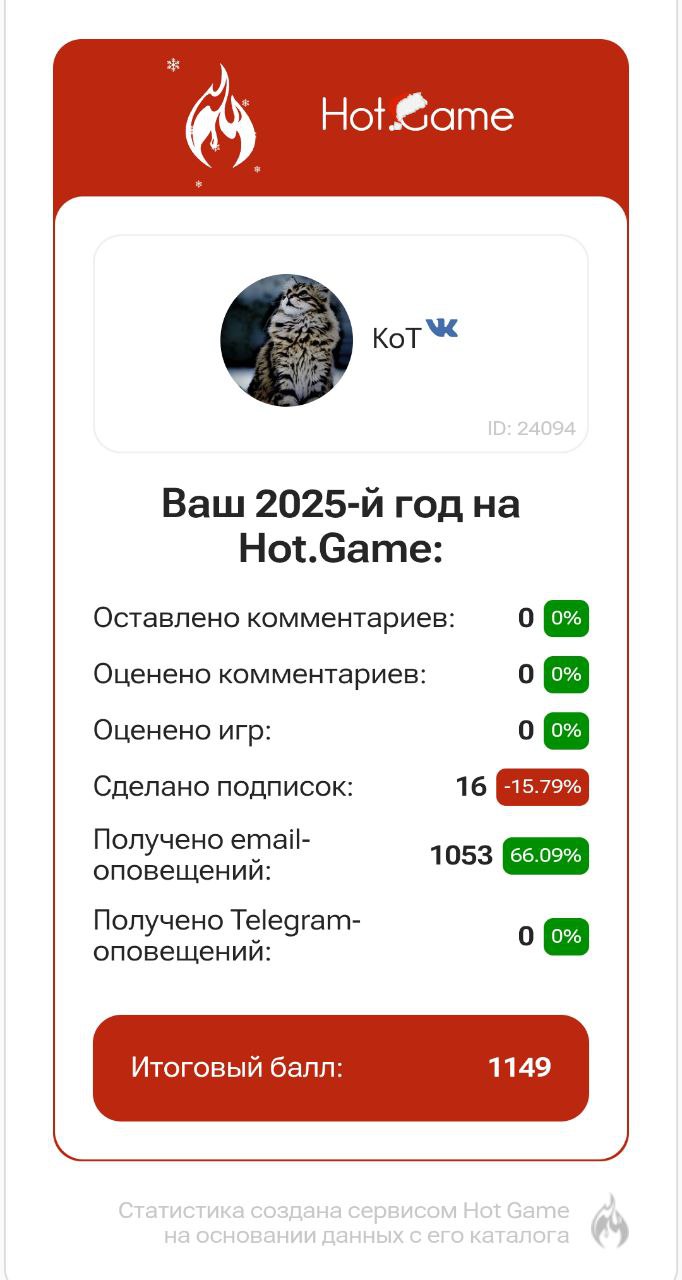 Мы подготовили нашу традиционную (уже 7-ю) годовую статистику! В этот раз мы расширили ее персональными данными о ВАС. На новой вкладке «я» вы сможете увидеть как вы провели этот год на Hot.Game.