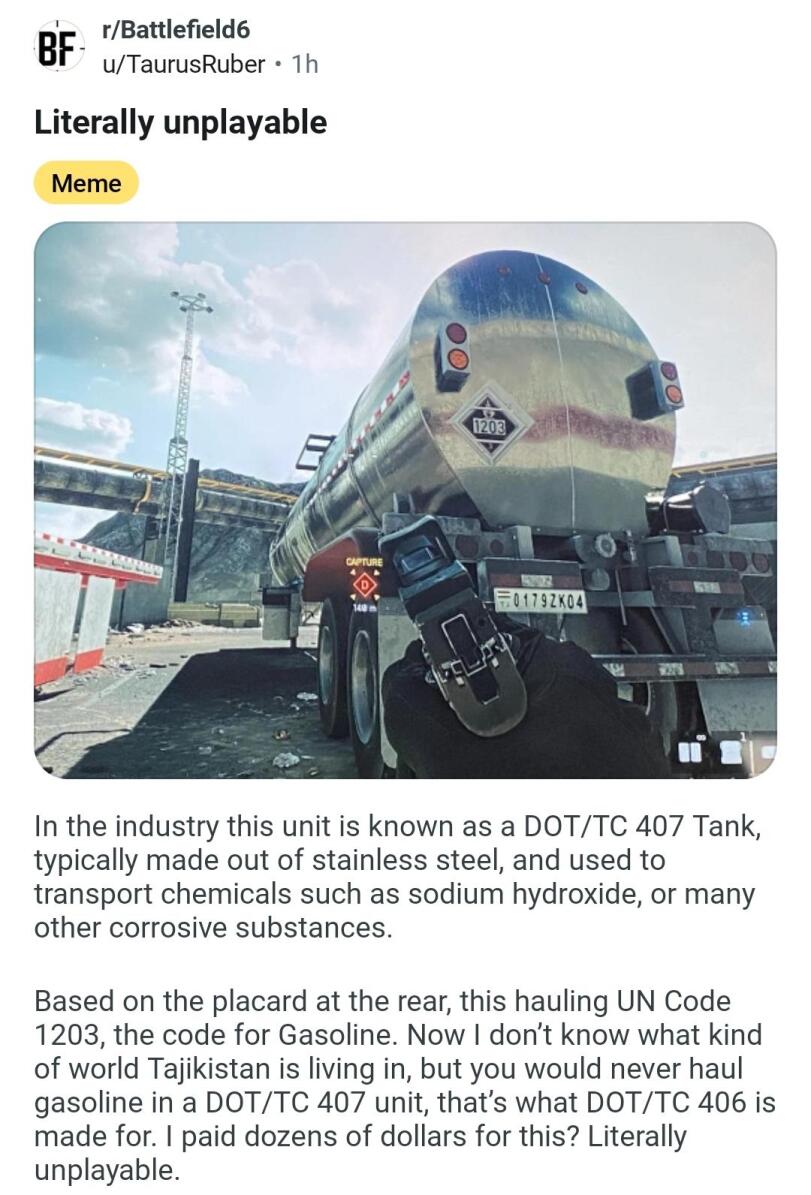 Судя по табличке сзади, она перевозит вещество с кодом ООН 1203 — это код для бензина. Я, конечно, не знаю, в каком мире живёт Таджикистан, но никто не перевозит бензин в цистерне DOT/TC 407 — для этого существует DOT/TC 406. Я за это заплатил десятки долларов? Буквально невозможно играть.