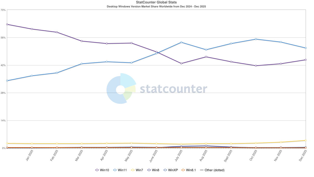Windows 11 столкнулась с заметным снижением рыночной доли: по данным Statcounter, с октября по декабрь 2025 года она упала более чем на 5 процентных пунктов, в то время как Windows 10, несмотря на окончание поддержки, укрепила позиции. Главный редактор Windows Central Даниэль Рубино считает, что проблема кроется не в функциях, а в доверии пользователей.