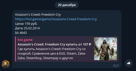 Это Telegram-бот для «продвинутого» слежения за изменениями цен на игры: дает возможность установить порог цены, только при достижении которого будет отправлено сообщение. При чем этот порог может быть как глобальным на все игры, так и индивидуально указан для каких-то конкретных. К тому же, дополнительно на порог влияет возраст игры, дополнение ли это или ранний доступ.