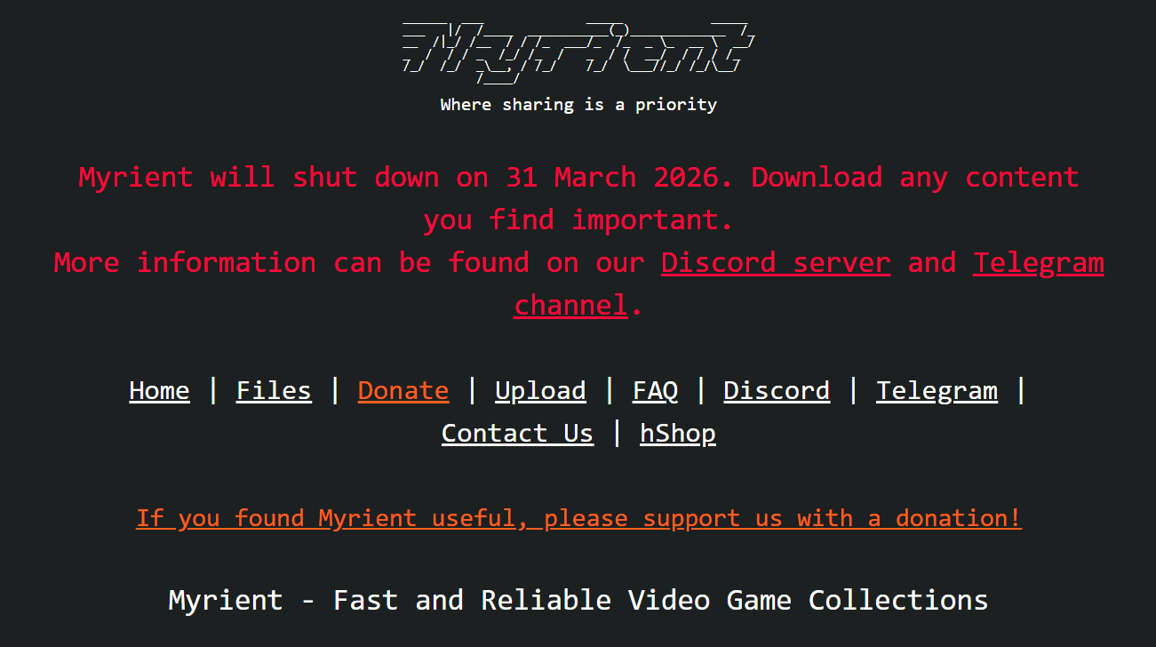 Игровой архив Myrient прекратит работу 31 марта 2026 года. Администрация объяснила решение ростом расходов: ежемесячно приходилось доплачивать свыше $6 000 из собственных средств на фоне увеличения трафика и стагнации пожертвований.