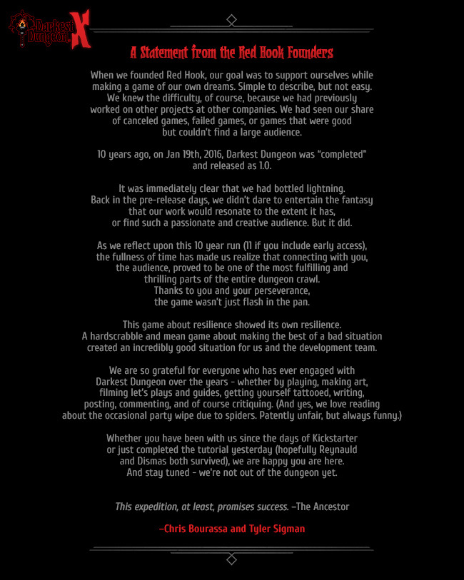 Студия Red Hook Studios отметила десятилетие релиза Darkest Dungeon и намекнула на возможные новости по франшизе. В юбилейном обращении разработчики поблагодарили сообщество и призвали «оставаться на связи», подчеркнув, что история игры ещё не завершена.