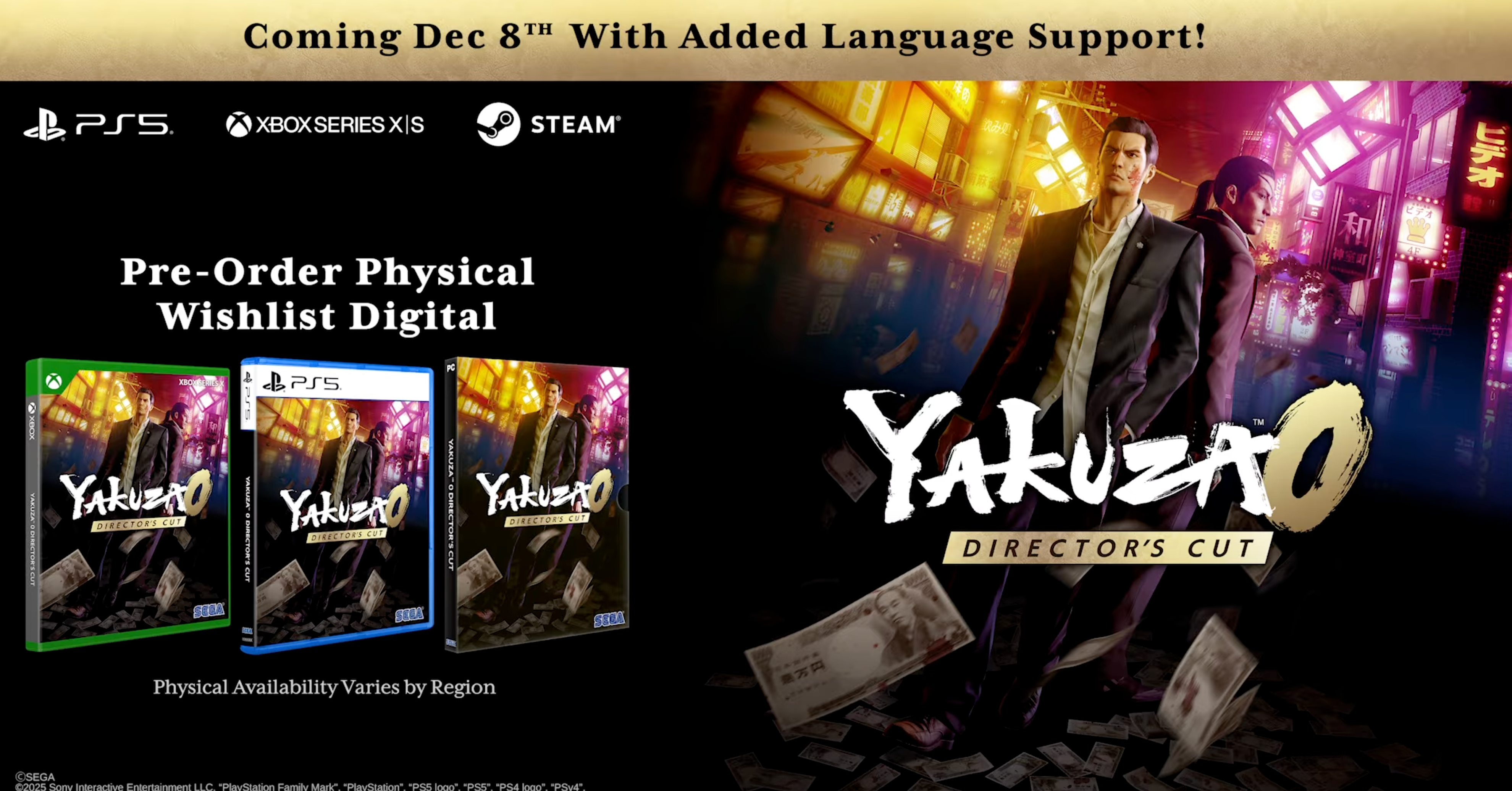 Yakuza 0: Director’s Cut уже доступна на Switch 2, а 8 декабря 2025 года появится на PC, PS5 и Xbox с улучшениями. Показали и закулисный ролик фильма Stranger Than Heaven, демонстрирующий прогресс с захватом движений.