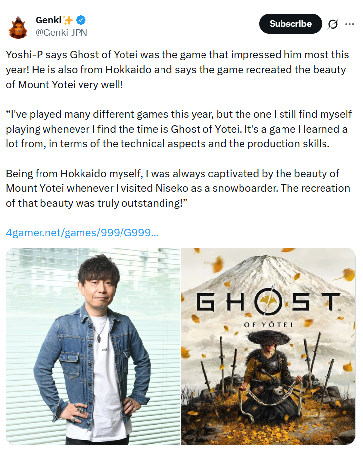 Продюсер и директор Final Fantasy XIV Наоки «Yoshi-P» Ёсида назвал Ghost of Yotei своей любимой игрой 2025 года. По его словам, это проект, к которому он продолжает возвращаться и из которого почерпнул многое в техническом и производственном плане.